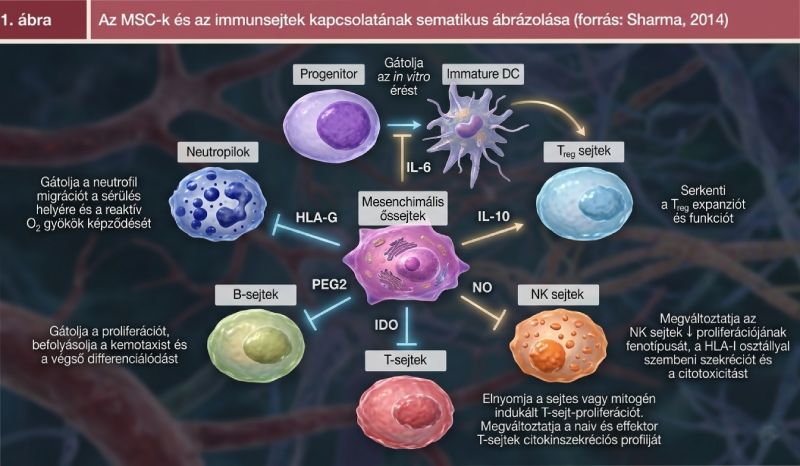 A mesenchymalis őssejtek gátolják az immunválaszban fontos szerepet betöltő T-, B-, NK-, antigénprezentáló sejtek aktivitását, egyes T-helper sejtek apoptózisát idézik elő és fokozzák az immunválaszt gátló regulátor T-sejtek osztódását. A részletesebben feltárt kapcsolataikat az 1. ábra foglalja össze.